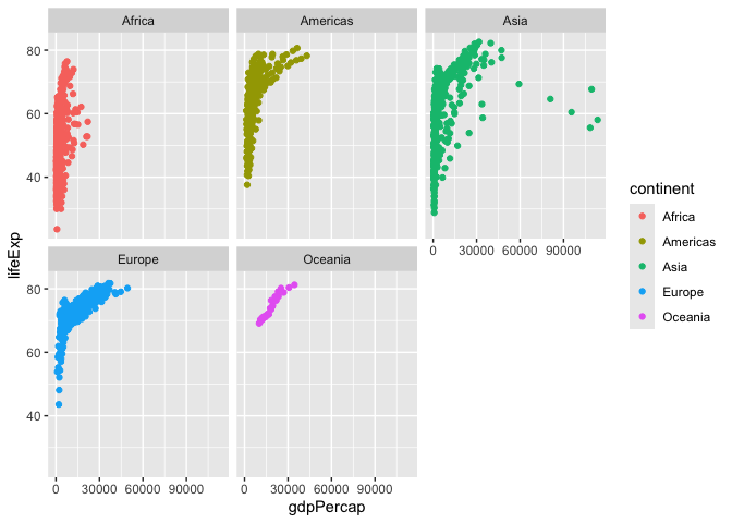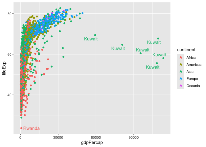 aes(x=gdpPercap, y=lifeExp, col=continent, label=country) +