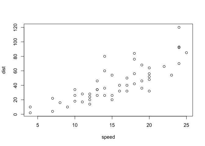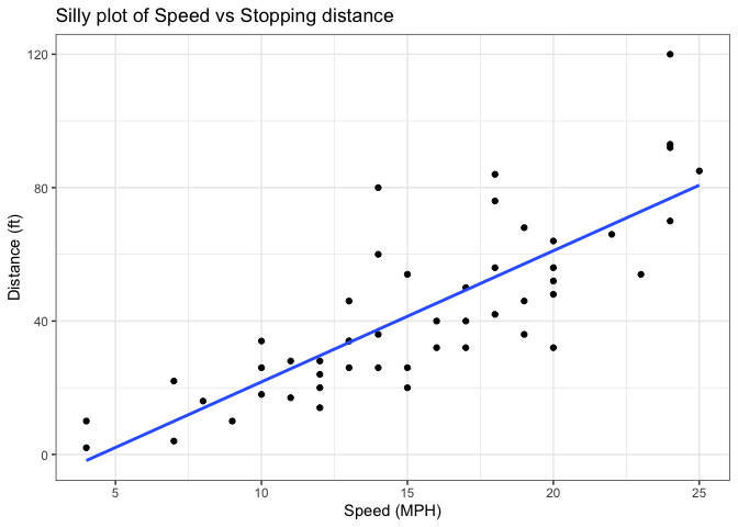 labs(title = "Silly plot of Speed vs Stopping distance", x = "Speed (MPH)", y = "Distance (ft)") +